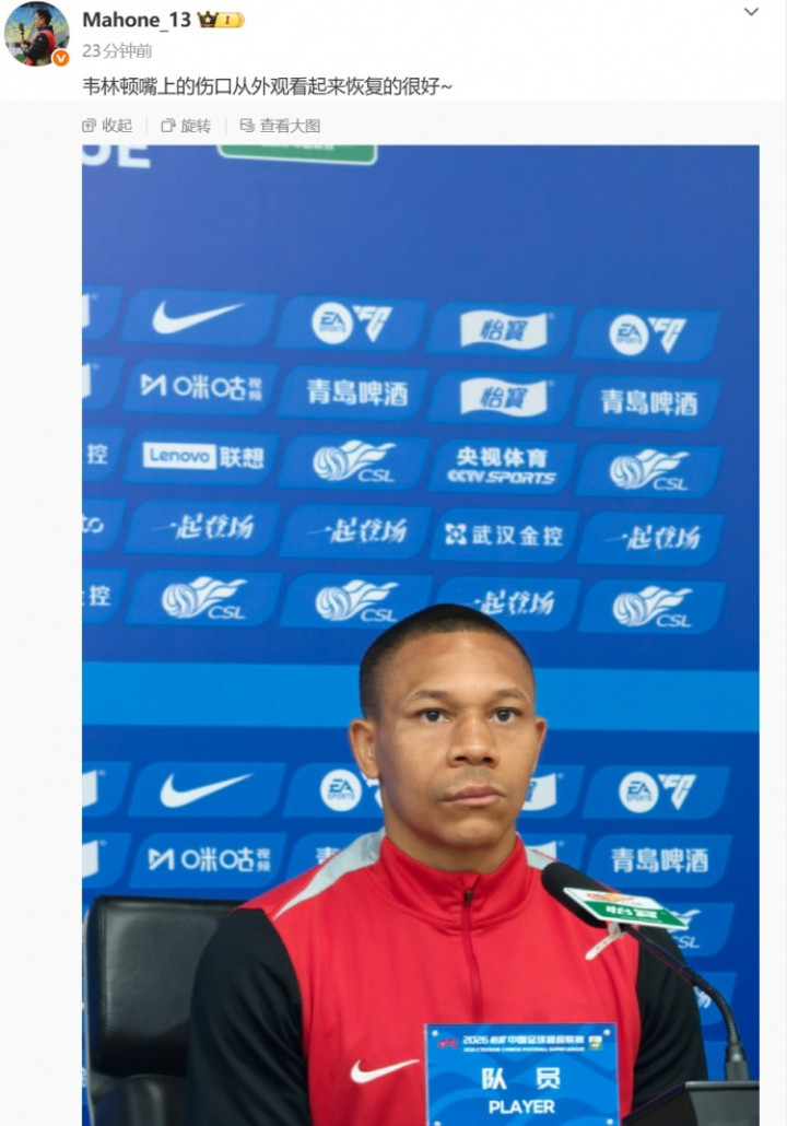 结合今天韦林顿出席赛前发布会的照片,该博主分析写道:“韦林顿嘴上的伤口从外观看起来恢复的很好~”
