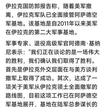 同时宣布,美军从伊拉克第二大空军基地撤军,移交给伊拉克军方。另一军事基地将于9月撤离。报道称,此系美伊双方达成的协议,但有无“伊拉克民兵组织”日益壮大不断攻击因素?